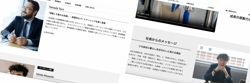 事業部紹介・社員紹介・福利厚生など、求職者が気になる情報を丁寧に伝える構成。コーポレートサイトよりもページ数は多めですが、既存テンプレートを活用することで制作コストは最小限に。写真や原稿など、貴社の魅力が伝わる素材をご提供いただければ、応募につながる設計で仕上げます。