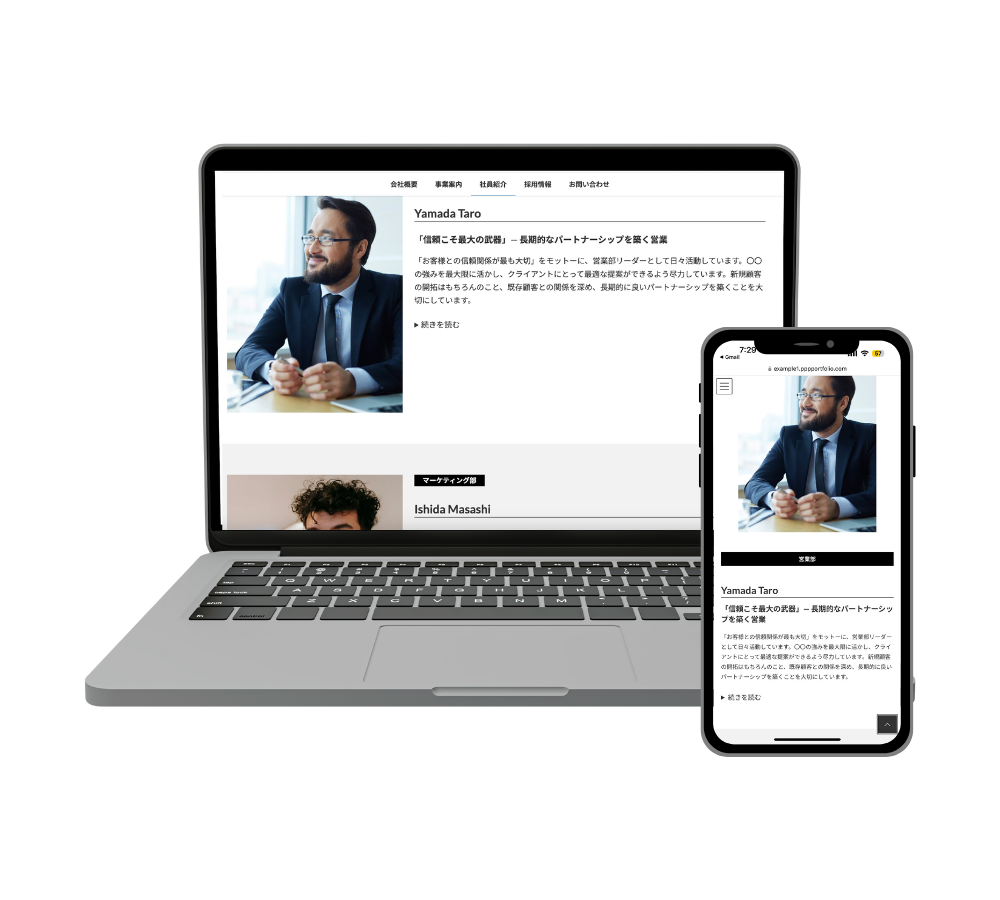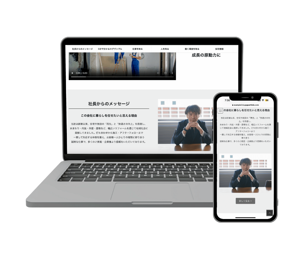 コーポレートサイトに必要な要素を厳選したテンプレート。画像とテキストを差し替えるだけで、自社の魅力をすっきり伝える構成です。初めてのWebサイトにも安心な構成で、スマホ表示にも対応。